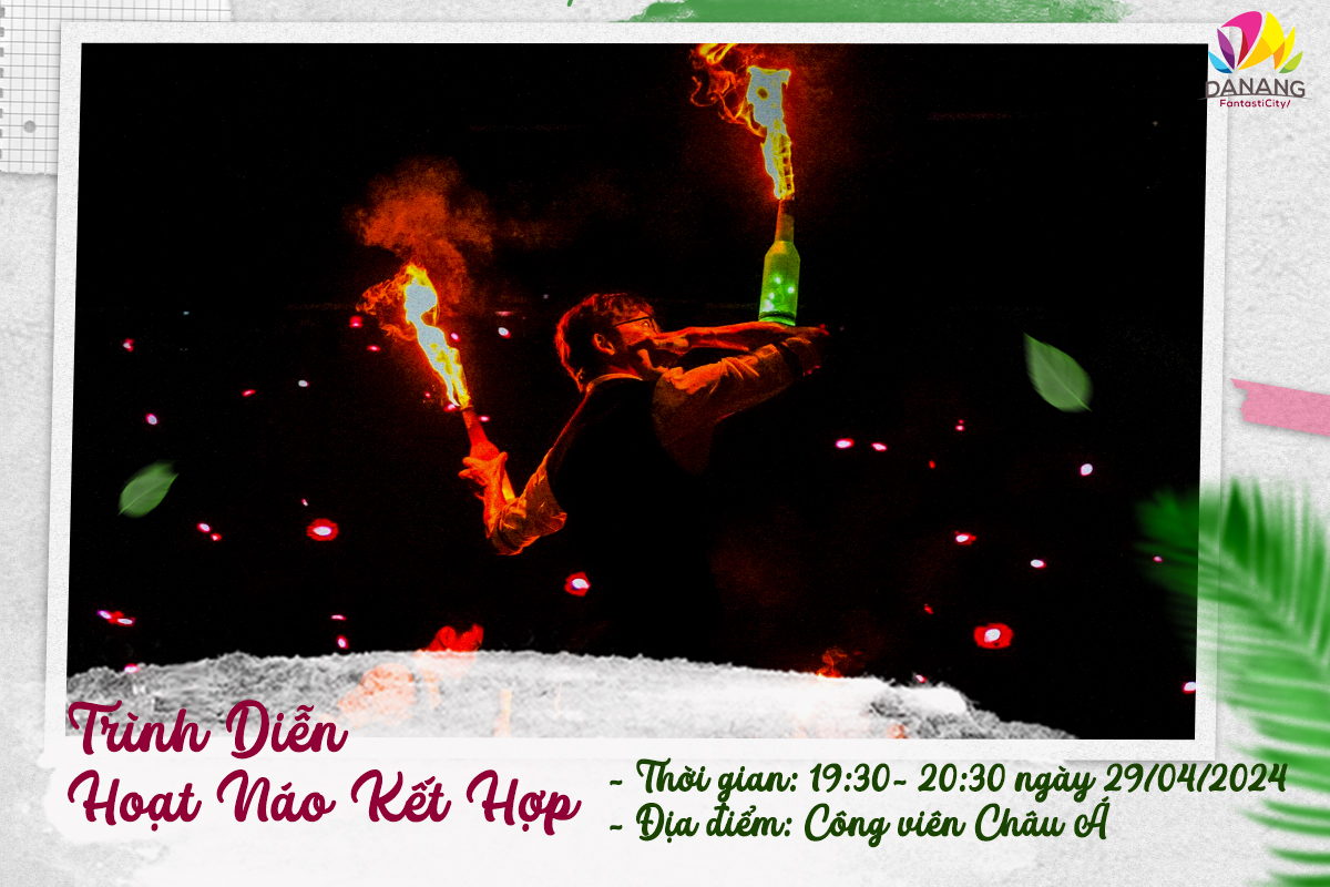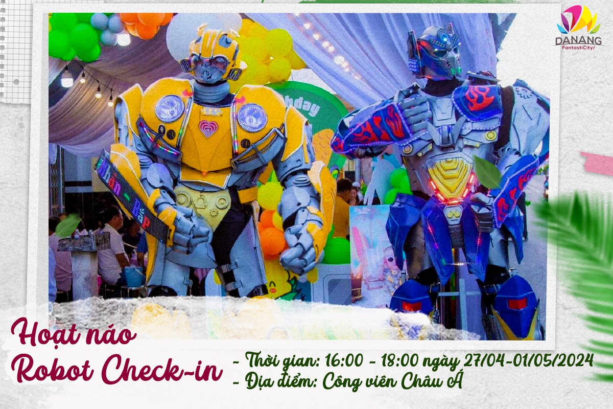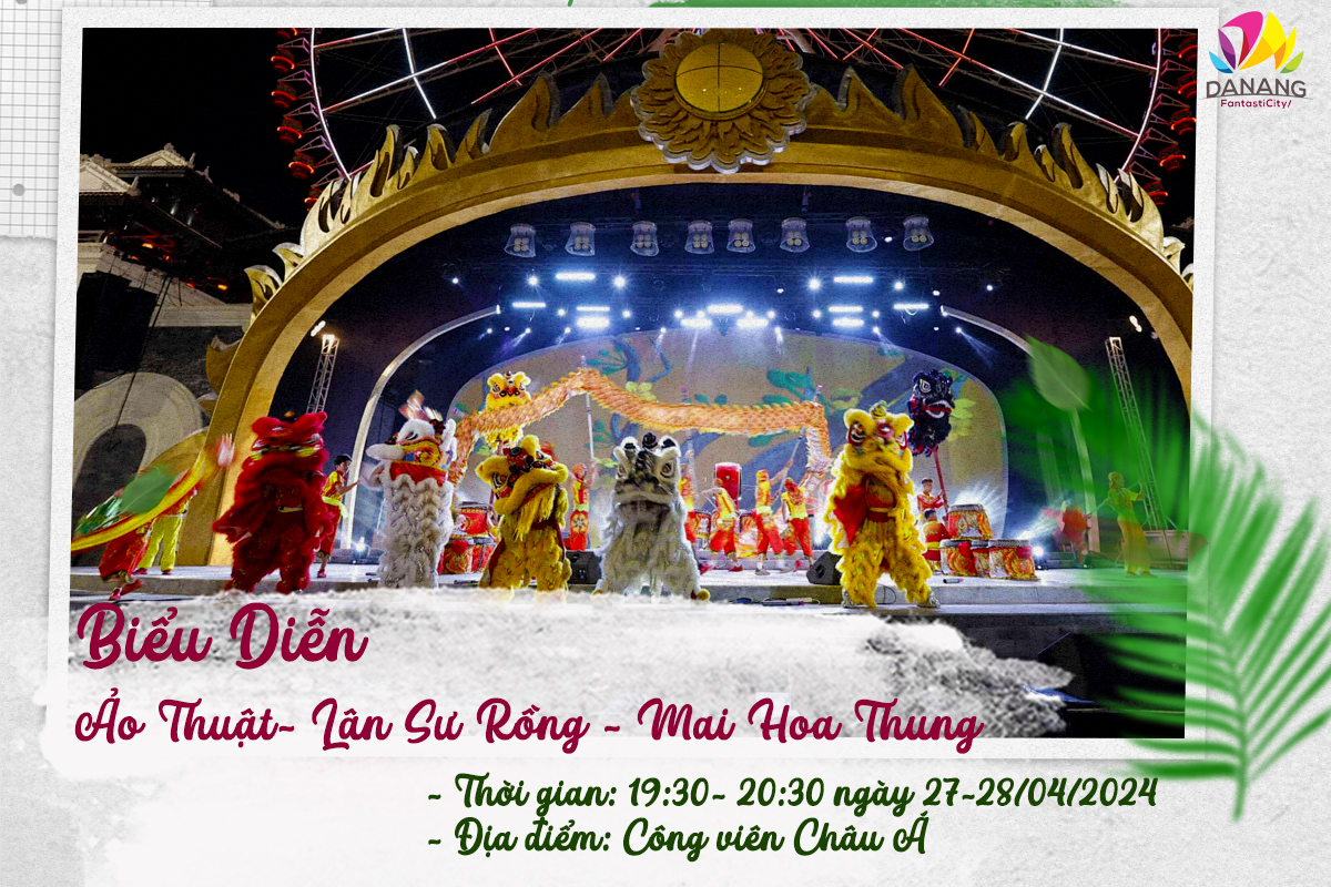 Dịp 30/4, công viên giải trí hàng đầu Miền Trung- Asia Park cũng sẽ rộn ràng với các hoạt động trải nghiệm hấp dẫn như trình diễn ảo thuật, Lân Sư Rồng và Mai Hoa Thung vào tối 27 và 28/4 trong khung giờ từ 19h30 đến 20h35; trình diễn xiếc từ 19h30 -20h30 tại sân khấu Sun Wheel tối 29/4 hay hoạt động hoạt náo “Robot check-in” cho trẻ nhỏ từ 16h đến 18h các ngày từ 27/04 đến 01/05/2024.