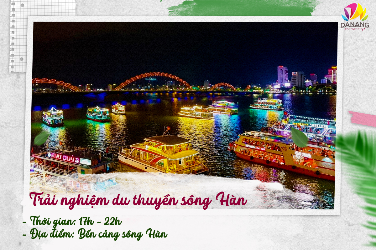 Đi du thuyền trên sông Hàn Đà Nẵng là một trong những trải nghiệm du lịch hấp dẫn nhất của thành phố biển. Khi tham gia, du khách sẽ có cơ hội chiêm ngưỡng toàn cảnh sông Hàn về đêm lung linh với ánh đèn đủ màu lấp loáng trên mặt nước. Bên cạnh đó, lựa chọn tham quan bằng du thuyền, du khách còn được ngắm nhìn những cây cầu bắc qua sông Hàn nổi tiếng như: Cầu sông Hàn, cầu Rồng Đà Nẵng,…