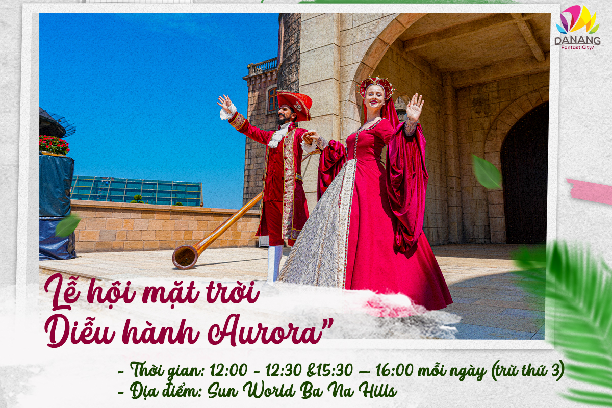 Trong khuôn khổ Lễ hội Mặt trời, show “Diễu hành Aurora” tôn vinh vẻ đẹp cao quý của thần Mặt Trời cũng sẽ chính thức “tái xuất” với 2 suất diễn hàng ngày (trừ thứ 3) vào 12:00 – 12:30 và 15:30 – 16:00. Show diễu hành quy tụ gần 40 nghệ sỹ quốc tế trình diễn đa dạng các loại hình biểu diễn nghệ thuật, hứa hẹn đem đến một bữa tiệc đầy màu sắc cho du khách.